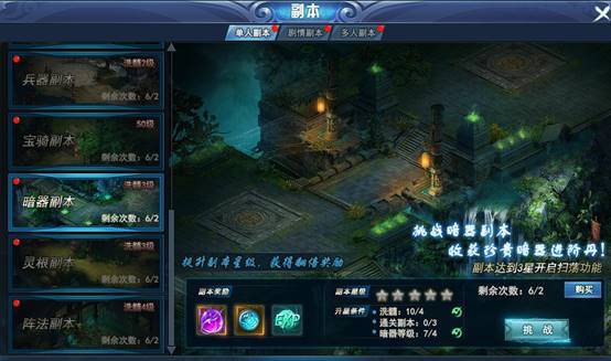 暗器副本: 每天可以挑战两次,挑战成功可以获得对应的进阶丹、资质丹。