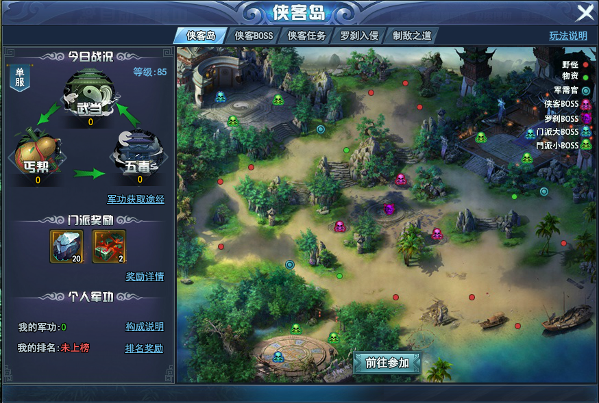 侠客岛中玩家以门派为单位参与玩法,可以通过抢夺其他门派物资,击败其它门派玩家,完成每日任务,击败野外BOSS获取军功,每日结束后将各门派的军功值给各个门派分发奖励。