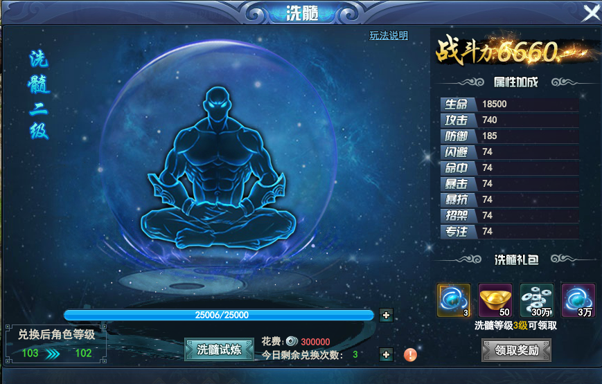 消耗经验和银币可以获得洗髓经验,洗髓经验满后可以进行洗髓试炼,成功挑战洗髓试炼副本即可进行洗髓升级。